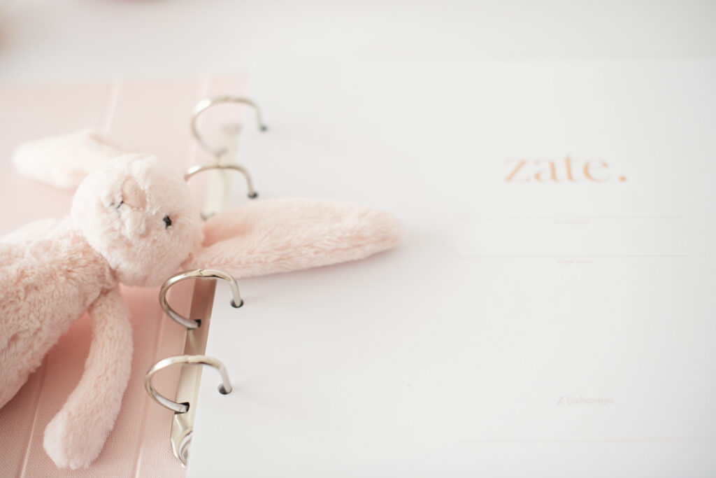 Tako je nastal album Zate. Idejo za dojenčkov album sem dobila zaradi povpraševanja svojih strank po oblikovanju bolj personaliziranih fotoknjig, ki bi vključevale fotografije, za katere so me najele (nosečniško fotografiranje, fotografiranje novorojenčka in prvega rojstnega dne) kot tudi fotografije iz njihovega osebnega arhiva (prve fotografije iz porodnišnice, prihod domov in prvi nasmešek) z dodatnimi pripisi njihovih osebnih misli, želj, citatov, letnic, … Zdelo se mi je, da pri takšnih fotoknjigah manjka še nekakšen osebni pečat, kot je recimo pisava staršev ter možnost vstavljanja fotografij po trenutnem navdihu, … Nekaj podobenga tistemu klasičnemu albumu, ki ga ima vsak od nas doma – kjer so shranjene vse fotografije iz našega otroštva in katerega še vedno radi prelistamo ob posebnih priložnostih. Tako je nastal album Zate, ki je moderna alternativa tradicionalnim dojenčkovim albumom, kombinacija dnevnika in klasičnega albuma za shranjevanje fotografij.